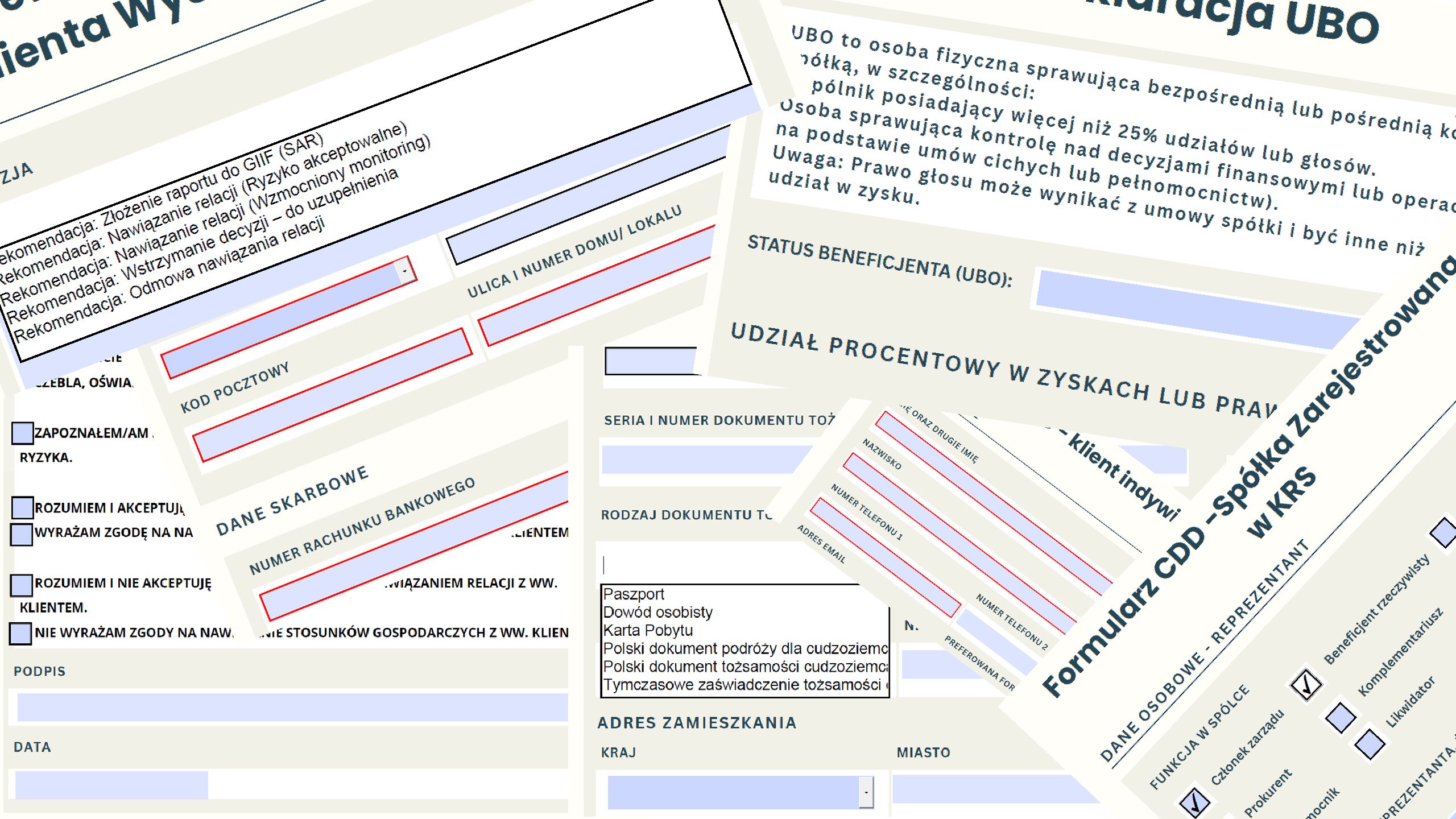 Dodatkowy, osobny formularz deklaracji UBO (Beneficjent Rzeczywisty) oraz PEP (Osoba Eksponowana Politycznie). Rozwiązanie to pozwala na rzetelną dokumentację nawet przy wieloosobowych strukturach właścicielskich, wykraczających poza standardowe formularze.
