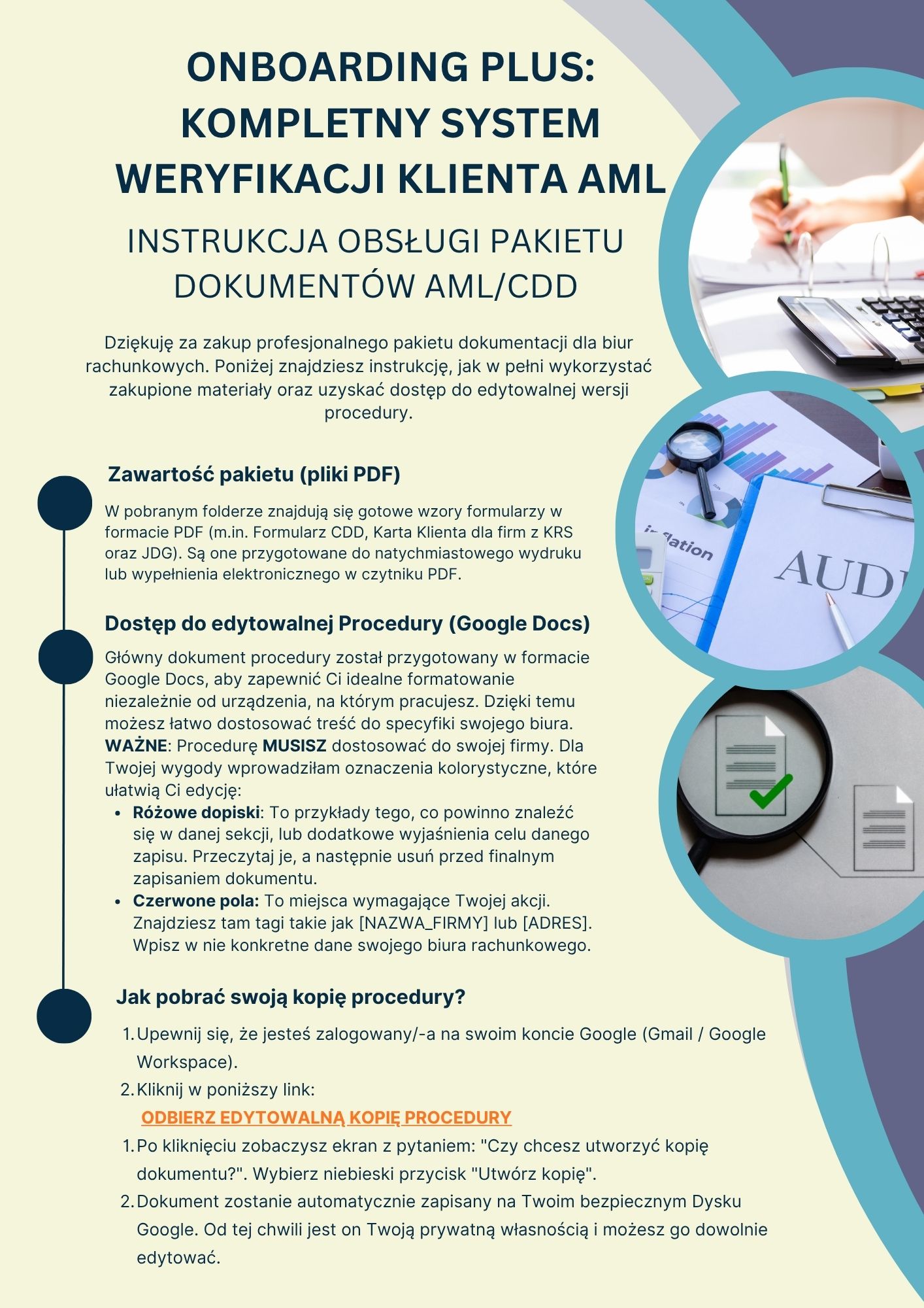 • Efektywność cyfrowa: Dzięki zastosowaniu inteligentnych pól w PDF oraz edytowalnych szablonów Google Docs (z gwarancją zachowania formatowania), proces wdrożenia dokumentacji w biurze trwa zaledwie kilka minut.